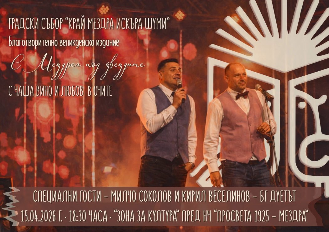 На 15 април Община Мездра кани жители и гости на града на благотворителна музикална вечер. Събитието е част от Великденския градски събор „Край Мездра Искъра шуми“. Организаторите обещават програма в по-романтичен и носталгичен тон. Акцентът е върху градските и шлагерни песни.